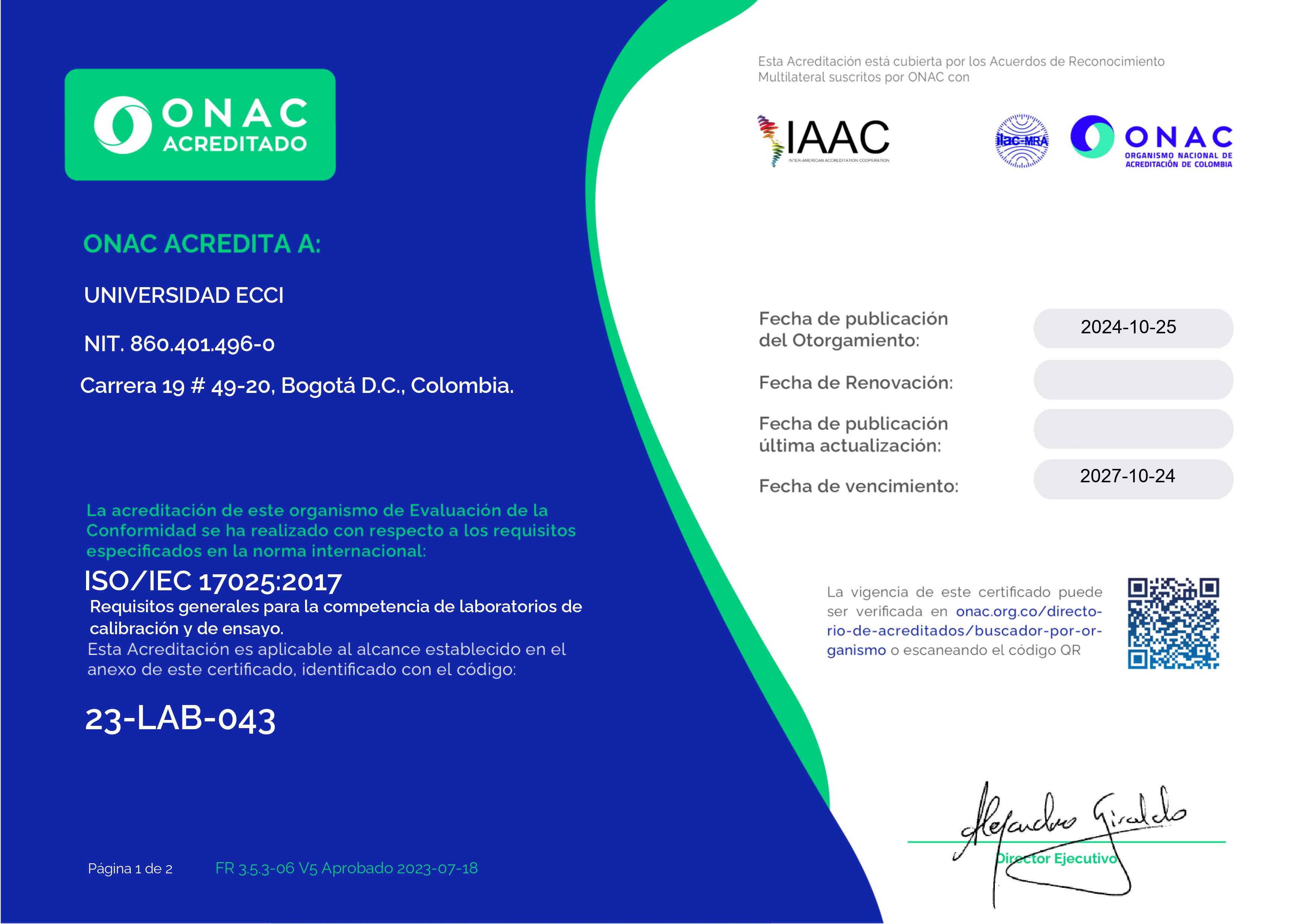 Desde 2014, el Laboratorio de Análisis e Investigación de la Universidad ECCI impulsa la calidad y la innovación en los sectores industrial y académico. Desde 2021 opera bajo los lineamientos de la norma ISO/IEC 17025:2017, garantizando resultados confiables en sus diferentes servicios. Con tecnología de vanguardia y un equipo altamente capacitado, ofrece servicios con independencia, transparencia y precisión